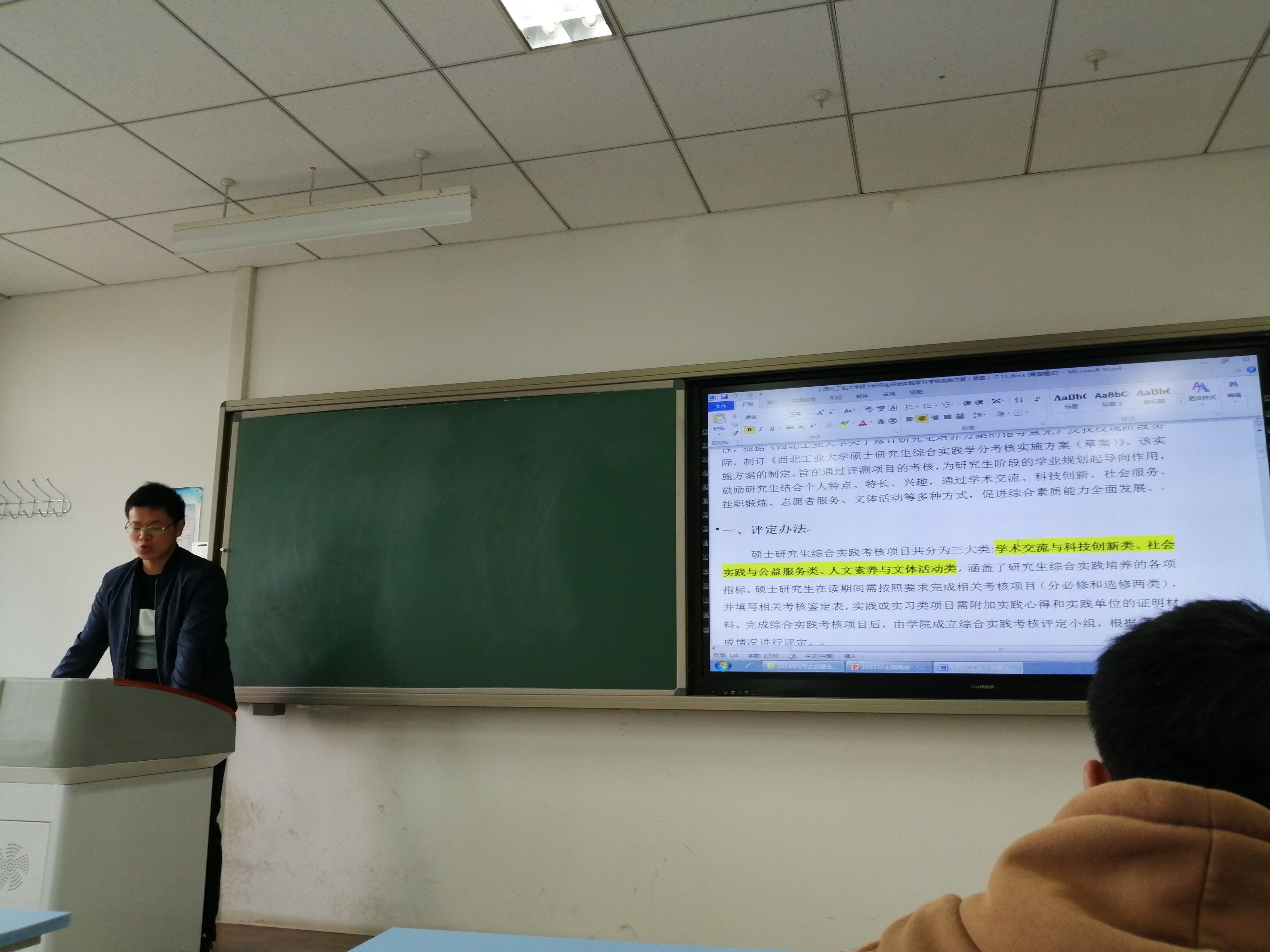 班会开始,班长胡轩豪同学先对上学期期末发的《西北工业大学硕士研究生综合实践学分考核实施方案》文件进行解读。《实施方案》主要包括学术交流与科技创新、社会实践与公益服务、人文素养与文体活动等三大类。通过对《实施方案》的解读,促使了大家对自己学业提前进行规划,同时这也有助于大家综合素质能力的全面发展。