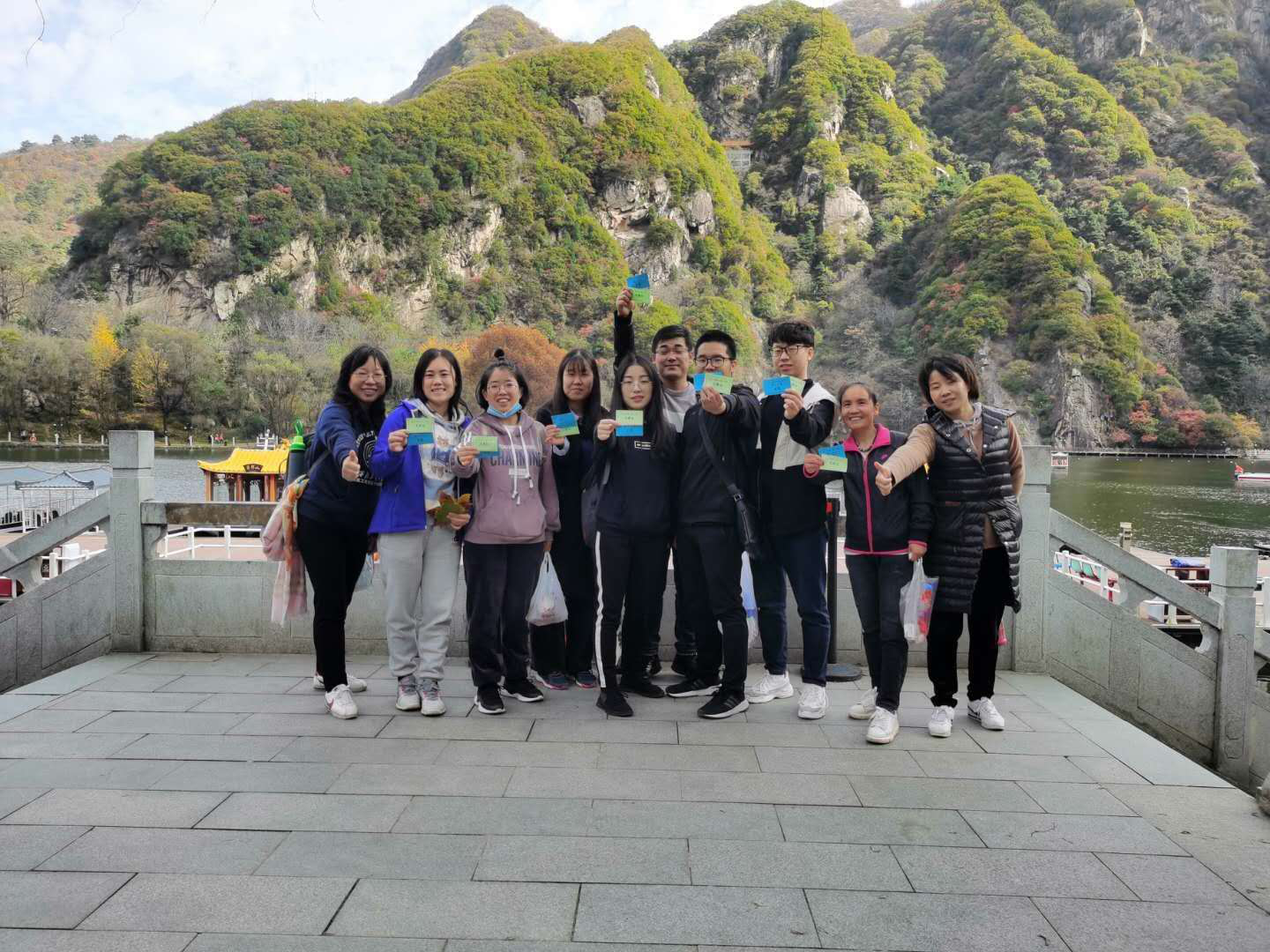山上的迎客松是本次爬山比赛的终点,经过近一小时的激烈角逐,所有队员均安全顺利地到达终点。兑换了完赛证后,队员们稍作休息,漫步在深秋铺满落叶的山林,环绕着碧波荡漾清明如镜的天池,踩着底下枯而不焦干而不燥的落叶,欣赏着姹紫嫣红层林尽染山间美景,工作中的紧张和压力得到了尽情的释放,心中不由自主地萌生一种快乐。