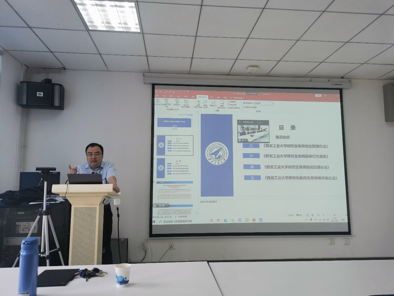 研究生导师培训大会,院长郑江滨带领全体研究生导师学习了《西北工业大学研究生导师岗位管理办法》、《西北工业大学研究生导师指导行为准则》、《西北工业大学研究生导师培训管理办法》、《西北工业大学研究生教育优秀导师评选办法》。