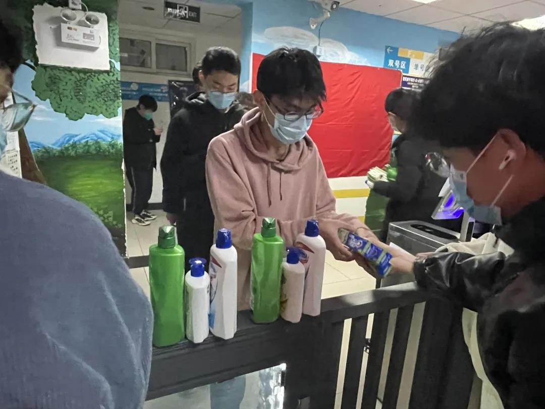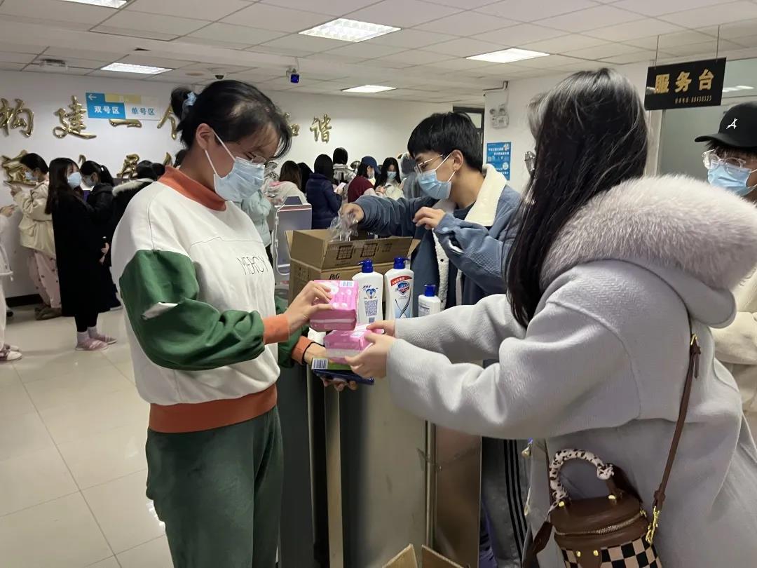 (学生志愿者为同学们发放物资)