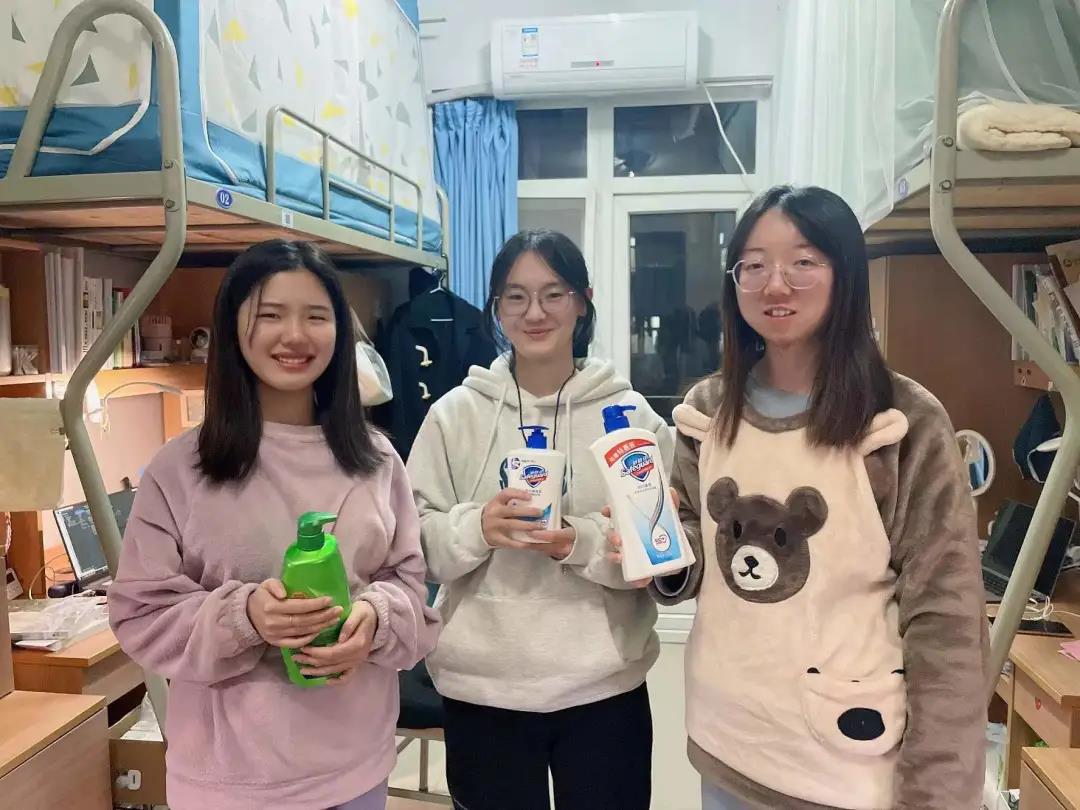 (拿到捐赠物资的同学们露出开心的笑容)