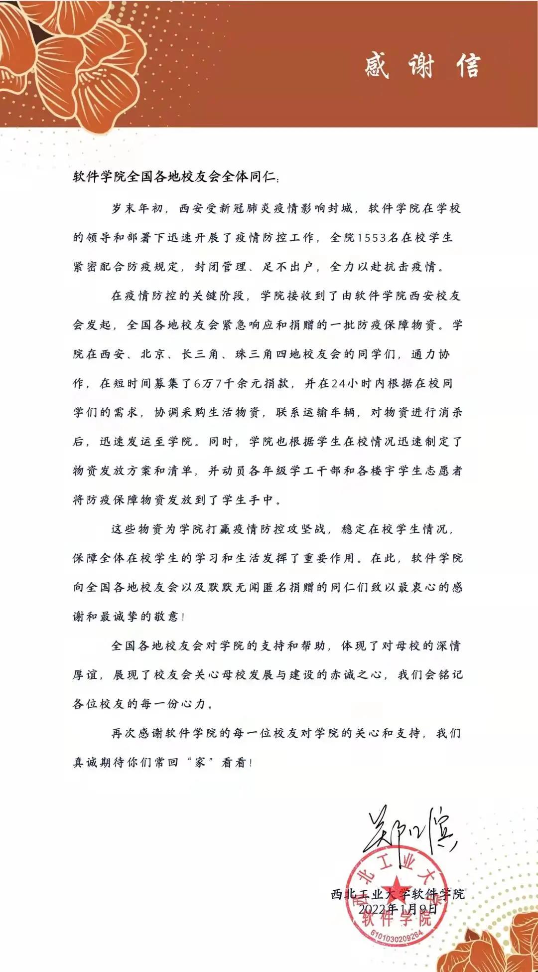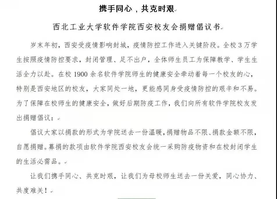 西安校友会发起捐赠倡议书,希望各位校友为学院送去一份温暖,与学院共克时艰。疫情见证了温情,同时也见证了软件人绵延的关心和情怀!