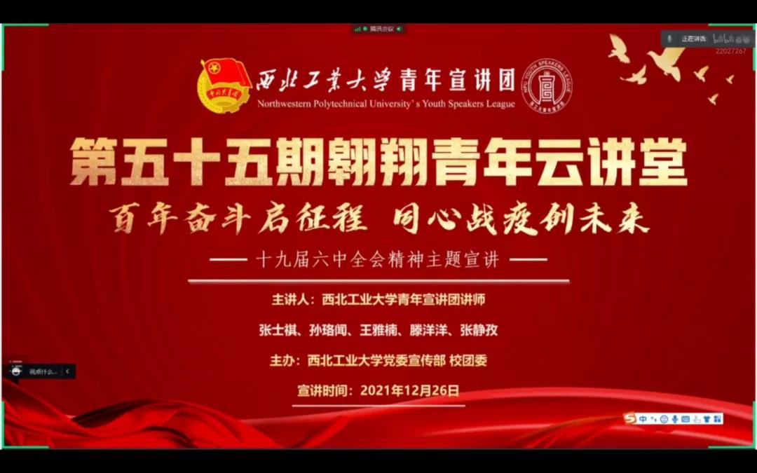 2021年12月26日, 由西北工业大学党委宣传部和校团委举办的“百年奋斗起征程,同心战疫创未来——十九届六中全会精神主题线上宣讲”团日活动顺利进行。本次活动的主讲人为西北工业大学青年宣讲团的五位讲师们。蜜桃传媒