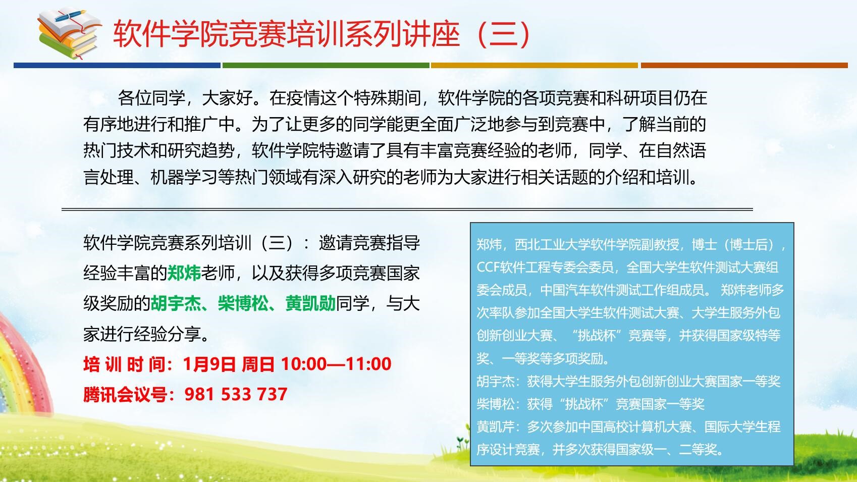 竞赛系列培训(三)∶1月9日周日10:00—11:00学院邀请竞赛指导经验丰富的郑炜老师,以及获得多项竞赛国家级奖励的胡宇杰、柴博松、黄凯勋同学,与大家进行经验分享。