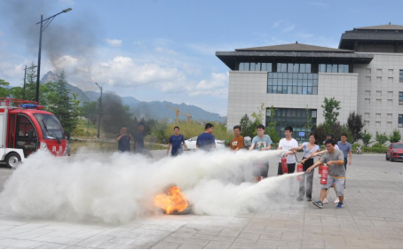室外灭火器实操演练环节,胡涛讲解了消防器材类型、灭火器使用要点和初期火灾处置等基本知识,并在室外现场模拟起火,指导师生分批正确使用灭火器。