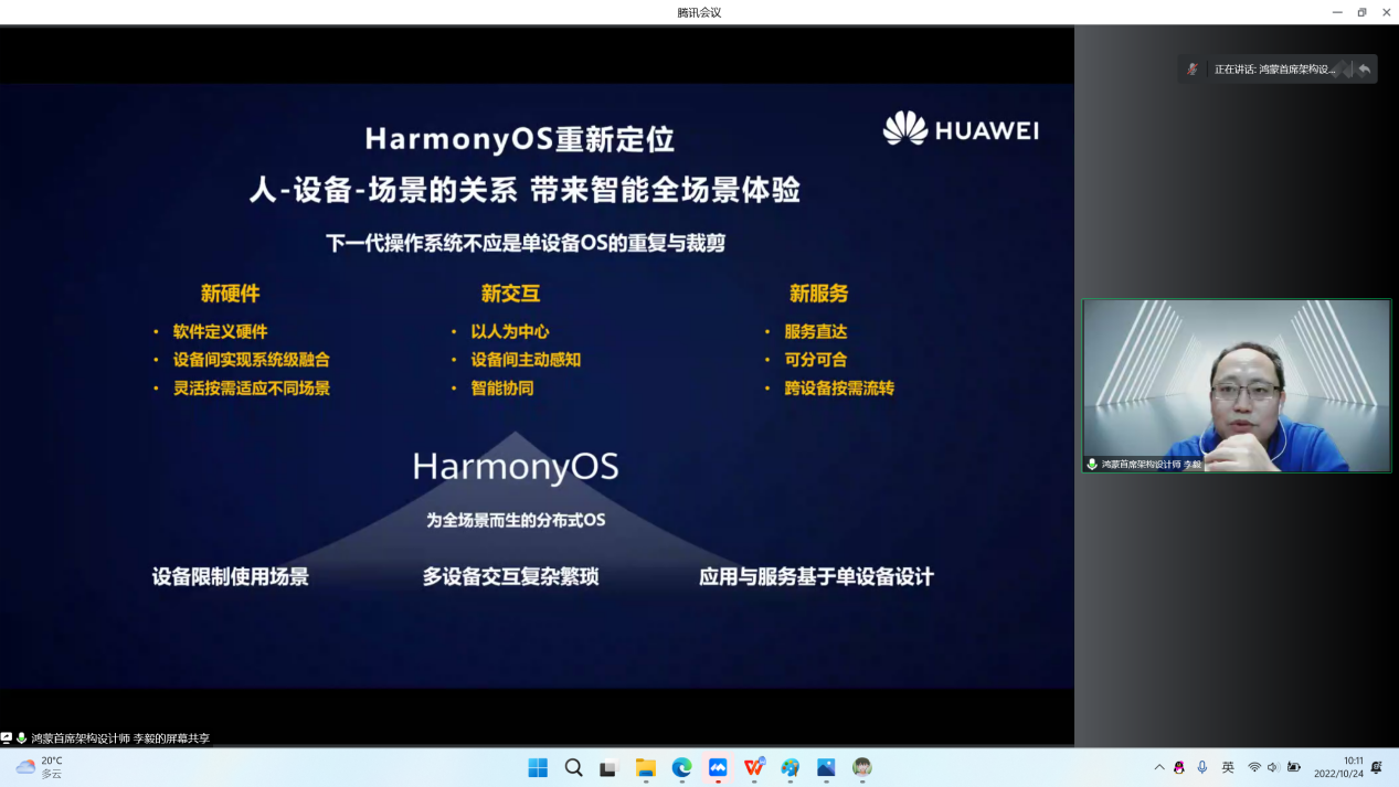 李毅作《鸿蒙OS架构设计思路》主旨报告,他表示,当今世界物联网飞速发展,PC、手机、Pad 及其他智能终端飞速发展,我们逐渐进入万物互连,万物智能的时代,鸿蒙OS 是一款面向未来的全场景分布式操作系统。为不同设备的智能化、互联与协同提供了统一的语言,带来简洁、流畅、连续、安全可靠的全场景交互体验。