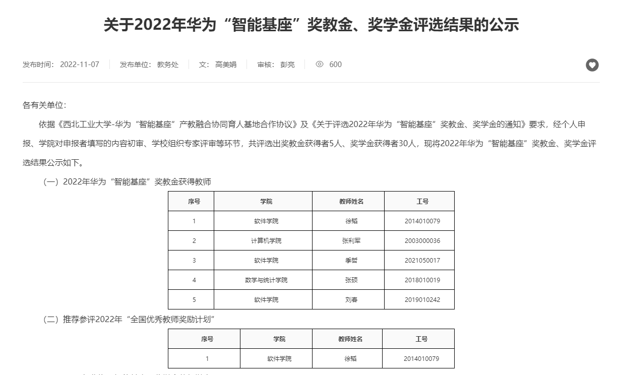近日,2022年华为“智能基座”奖教金、全国优秀教师奖励计划评选结果出炉公示。蜜桃传媒
