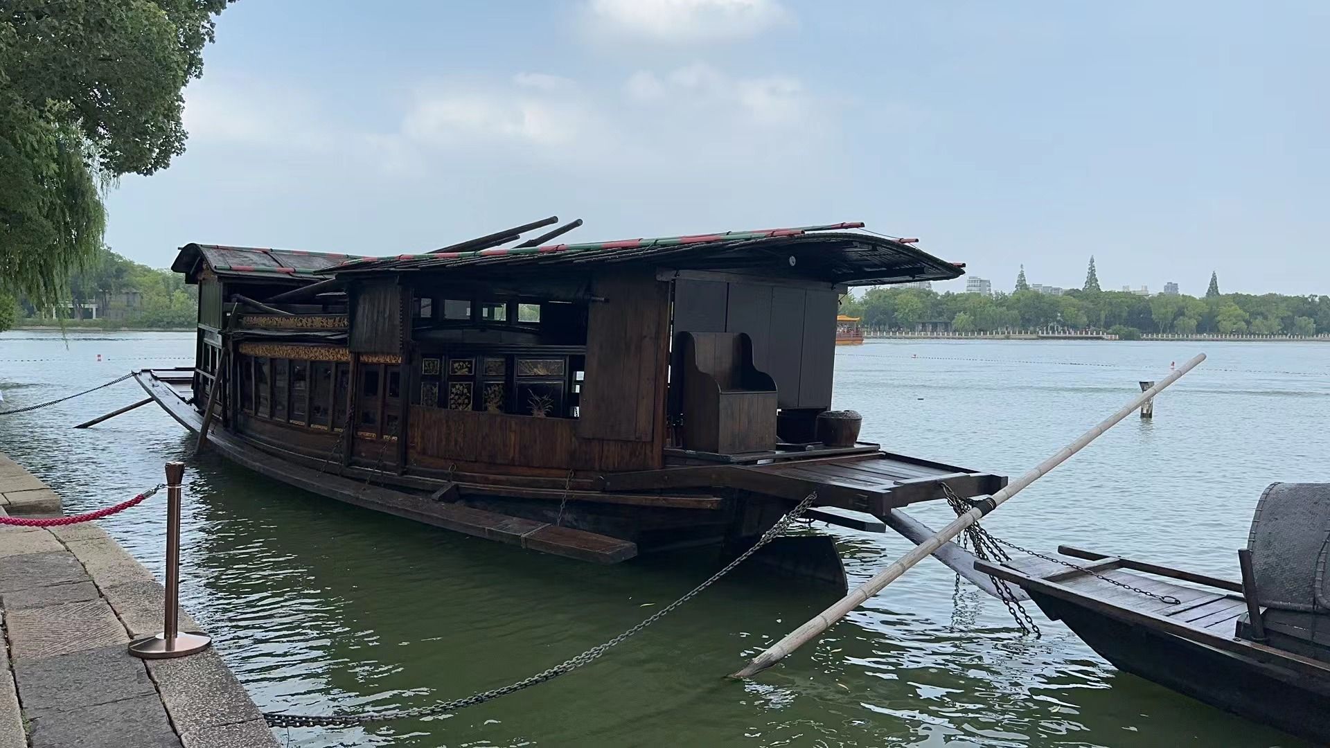 七月正是火热的季节,乘船前往湖心岛,昔日的红船静静地停泊在烟雨楼前,大家在红船前驻足瞻仰,回顾这一百多年来“一个大党和一条小船”的故事。