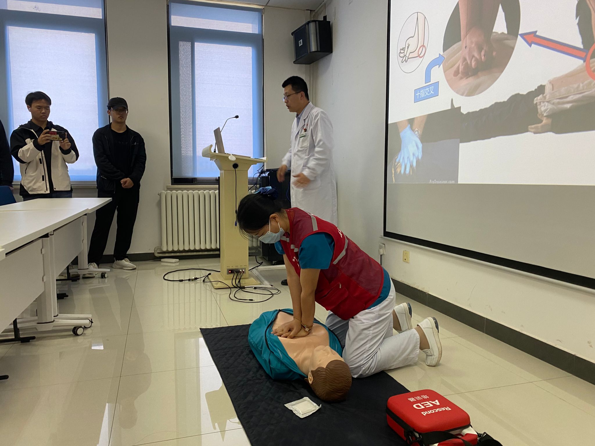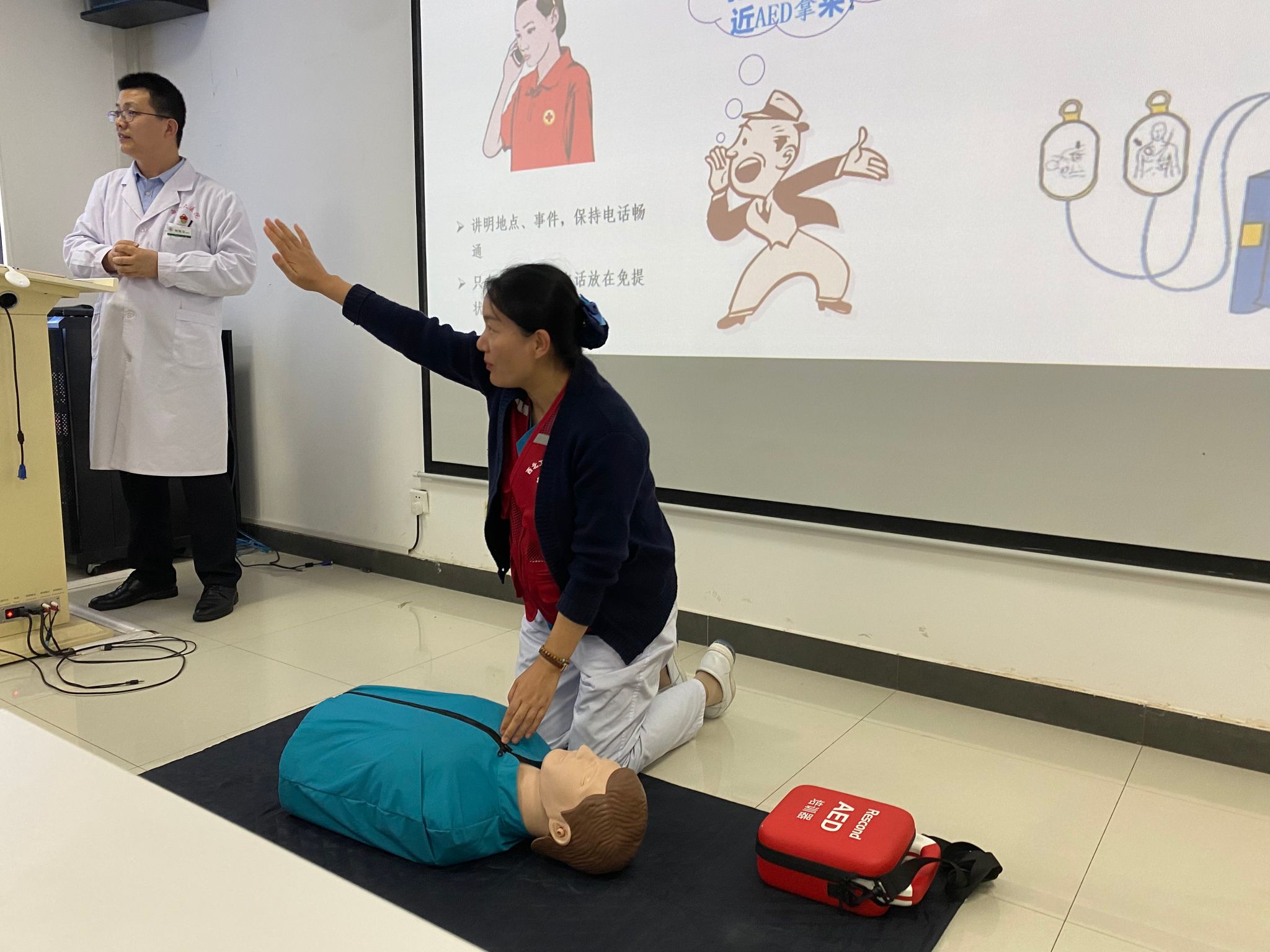 师生详细讲解了心肺复苏基本理论知识、徒手心肺复苏术的操作要点、AED的使用以及海姆立克急救法的操作要点等急救知识与技能。